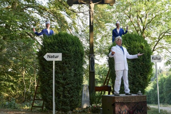 Natur fasziniert uns, wir suchen sie, finden sie aber doch kaum. Nichts ist noch urwüchsig, alles ist Kulturlandschaft. Die menschliche Hand ist überall sichtbar. Auf der Suche nach dem Geist der Natur finden wir vor allem Spuren, die wir hinterlassen haben. Was können sie uns erzählen, über den Mensch und seine Rolle auf der Weltbühne? Was können uns Wanderer, Bauer, Jäger, Baumbarde und Holzfäller, Klimaaktivistin, Vogelstimmenlauscher und Waldbadende vermitteln? Was möchten uns Wiese, Wald und Wind, das Reh, der Vogel oder die Bäume auf der Lichtung sagen? Der Mensch bewundert und fürchtet die Natur. Seit jeher bewegt er sich in diesem Spannungsfeld. Er ist ihr Nutznießer, ihr Gestalter, ihr Schützer und ihr Vernichter. Die Natur antwortet, reagiert. Wer spielt letztendlich die Hauptrolle in diesem Welttheater?