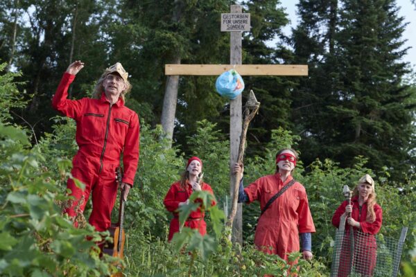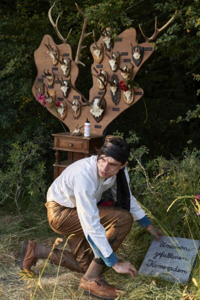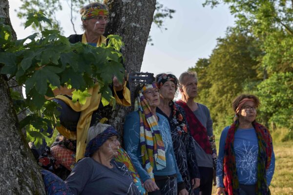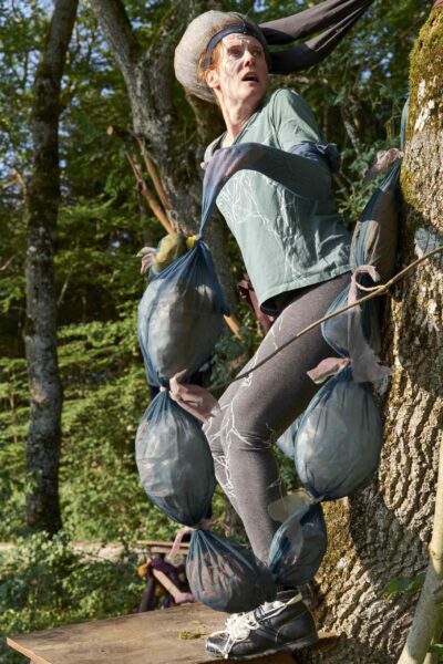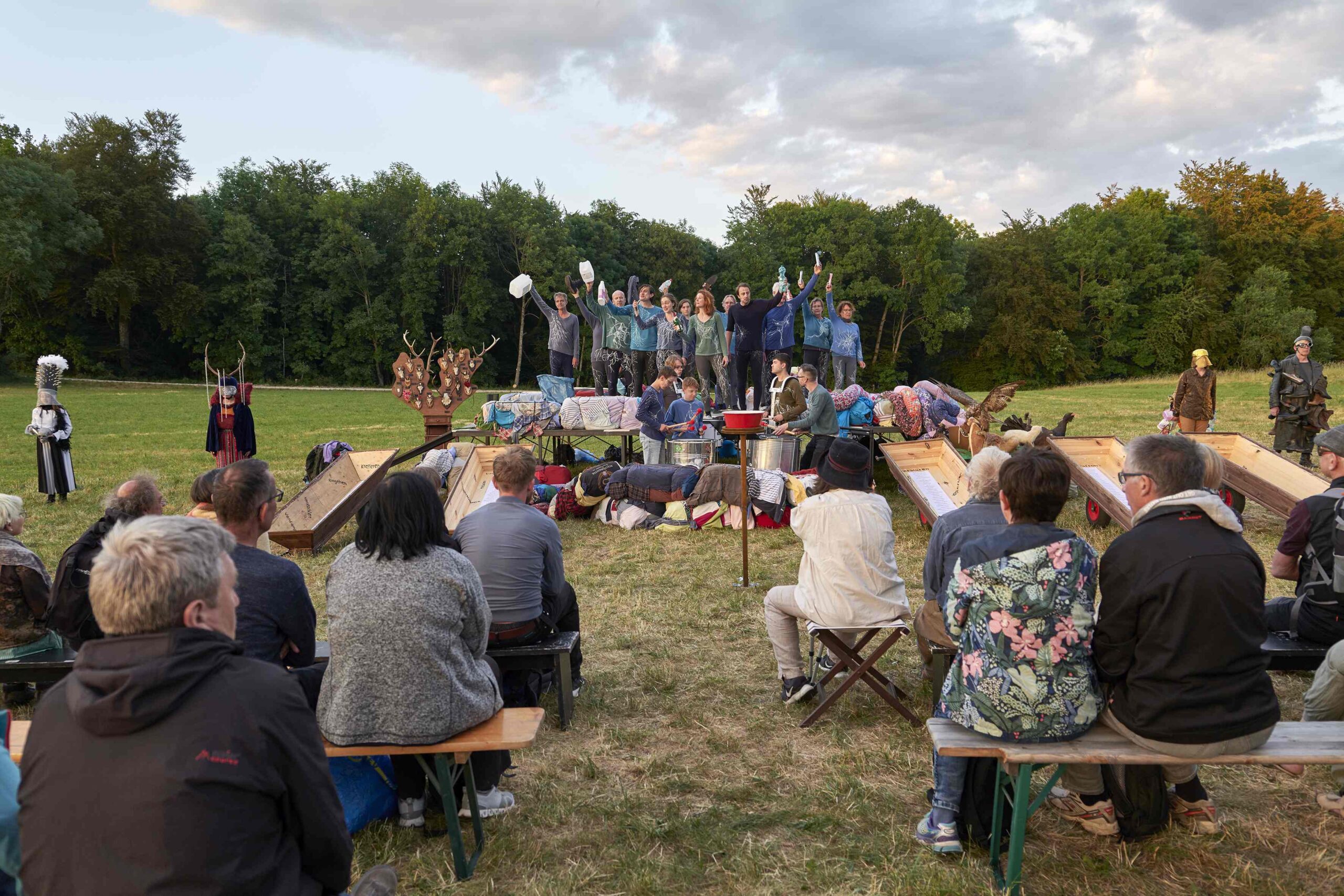 Wie der Titel des Stücks „Auf offener Lichtung“ bereits verrät, wird sie zur Bühne und zum Mittelpunkt der dreistündigen Theaterwanderung in der Nähe des Köbele bei Salmendingen. Inhaltlich fernab jeder Trivialität ist das Stück zunächst etwas verwirrend, Konzentration von der ersten Minute an gefordert. Das Verhältnis von Mensch und Natur wird darin in unterschiedlichen Facetten beleuchtet und die Abhängigkeit klar benannt: Die Natur braucht den Menschen nicht, sondern der Mensch die Natur, die er fortwährend zerstört. Ein Trommelwirbel eröffnet das Abschiedsfest der Menschheit. Immer schneller, immer bedrohlicher vermittelt die Musik die Endzeitstimmung, die zugleich zum Neuanfang wird. Wir sind von Bäumen umgeben, die Abendsonne hüllt die Wiese in ein goldenes Licht. Sie alle haben uns gewarnt: die Tiere und Pflanzen, die in einer Formation auf der Bühne stehen. Die Natur erhebt ihre Stimme und hält der Menschheit einen Spiegel vor. Das Stück trägt erstaunlich weit bleibt spannend, ist zuweilen poetisch und düster. Die Tragik birgt aber auch humoristische und plakative Elemente, etwa wenn das Publikum am Rande der Lichtung zwei vermummte Gestalten entdeckt, die Obstbäume mit bunten Staubwedeln bearbeiten. Die Inszenierung fordert das Publikum, verstört, legt den Finger in die Wunde. Was rüberkommt: Das Zerstörungswerk unserer Lebensgrundlagen ist längst eskalierte Wirklichkeit. (Sophie Holzäpfel)