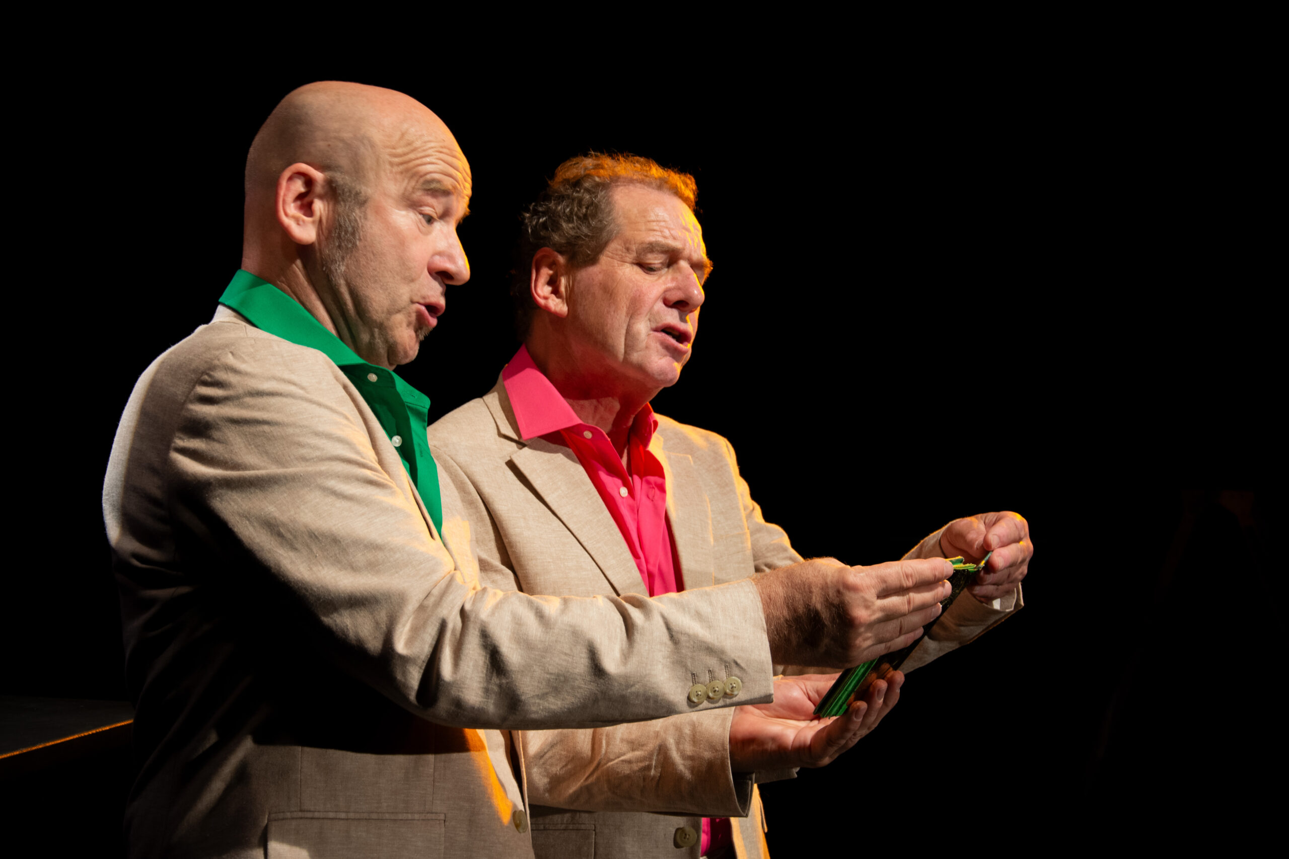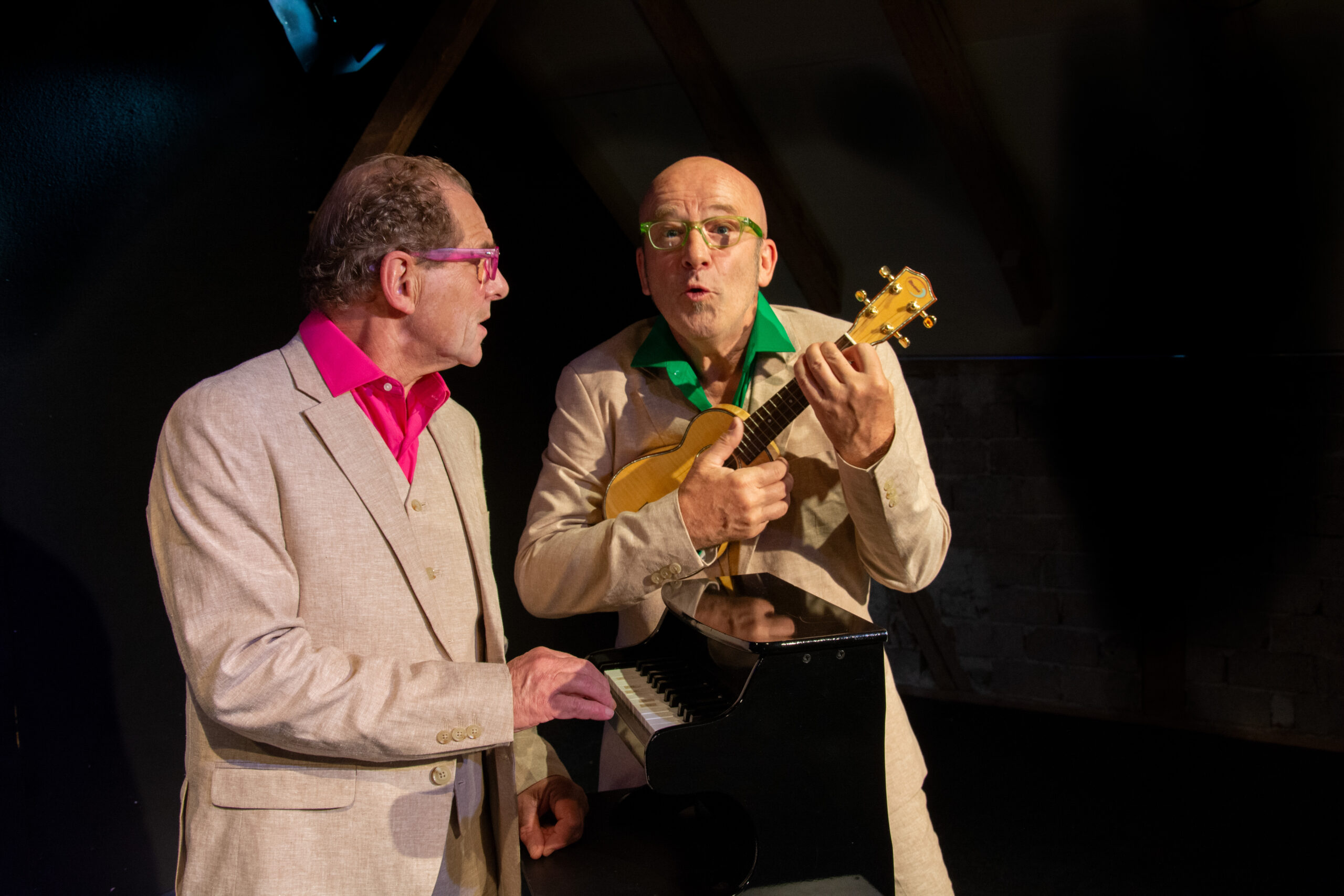 Robert und Josef, wie die Bühnenfiguren heißen, tauschen sich beim durchsichtigen, zuletzt grünen Most über Wehwehchen aus und kommentieren hintersinnig die Zeitläufe. Sie sinnieren darüber, dass der Dialekt bereits auf dem Rathaus angekommen sei. Liebevoll zerpflückt das Duo französische Lehnwörter wie Trottoir und Souterrain. Schwäbische Erfindungen werden gewürdigt, Geistesblitze prasseln ohne Verhaspler. Es wird zitiert und gesungen: Texte und Szenen von Manfred Hepperle, Helmut Pfisterer, Sebastian Blau. Ein herzerwärmendes „Winterlied eines schwäbischen Bauernjungen“, im zweiten Teil eine Moritat vom Feldkreuz. Die beiden Erzkomödianten spaßen über schwäbische Ordnungsliebe, über „Sotte und Sotte“, zitieren Unsinns-Poesie herbei. Nach einem finalen Schwabenrap Arm in Arm zum Mitsingen erklatscht sich das Publikum eine Zugabe. (Matthias Reichert)