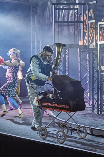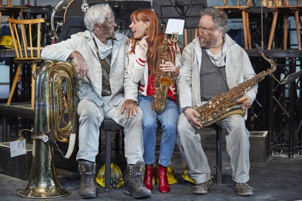 Wenn hier die Bergarbeiterkapelle auftritt, die Notenblätter nur mit Grubenlampen beleuchtet, ist man als Zuschauer schon ganz tief drin im Milieu der nordenglischen Kumpels. Die Konzert-im-Theater-Situation macht das Publikum im Regiekonzept von Christoph Biermeier implizit zu Mitspielern. Denn das Publikum, das ist hier die Gesellschaft, bei der die Bergarbeiter mit ihrer Not Gehör suchen. Der Reiz des Stoffs liegt im ständigen Kippen zwischen burleskem Schwank und menschlicher Tragödie. Das ist es, was die Lindenhöfler am besten können. Der Halbrunde, drehbare Bühnenaufbau ist dabei Konzertpodium wie Probenraum, ist Komödienkarussell wie Schicksalsrad. Mona Maria Weiblen bringt als junge Gloria viel Frische in die Aufführung. Weiblen verkörpert das mädchenhafte kess und bläst auch noch ein berückend schönes Solo auf dem Saxofon. Bernhard Hurm ist als alter Bergmannskumpel Danny ein Kapellmeister wie aus dem Bilderbuch: mal skurril und wunderlich, dann wieder tragische Gestalt. Die eigentliche Tragödie vollzieht sich jedoch an Gerd Plankenhorn als seinem Sohn Phil: vom Vater auf die Musik eingeschworen, von der Frau bedrängt, zerreißt es ihn förmlich. Ihm gelingt eine ergreifende Balance zwischen Komik und Abgründigkeit. Und das ist die Botschaft der Geschichte: Im Angesicht der kapitalistischen Zumutungen sitzen alle in einem Boot – oder in einer Kapelle. Dass es in diesem Fall eine durchaus reale Kapelle ist, hat dabei seinen ganz eigenen Charme. (Armin Knauer)