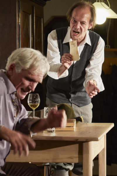 "Stefan Hallmayer gerät mit seinem Oberhuber in so manche argumentatorische Zwickmühle. Er spielt ihn so elegant wie rustikal, als so feurigen wie schnell beleidigten Hitzkopf, der, wenn ihm was nicht passt, schon auch mal das (unfertige) Schachspiel vom Tisch fegt oder gleich die Flucht ergreift. Aber Martin Olbertz, der seinen Chaim mit einem östlichen Akzentdeutsch versieht, steht ihm in Sachen Ausgefuchstheit und Reizbarkeit in Nichts nach. Und so entfaltet sich ein knackiger Schlagabtausch, bei dem jeder meint, er hätte den anderen intellektuell schon längst im Sack. Bis zum Schluss bleibt spannend, welche neue Wendung die Ahnenforschung noch nimmt und wer die Fäden eigentlich in der Hand hält." Kathrin Kipp, 10.11.2018