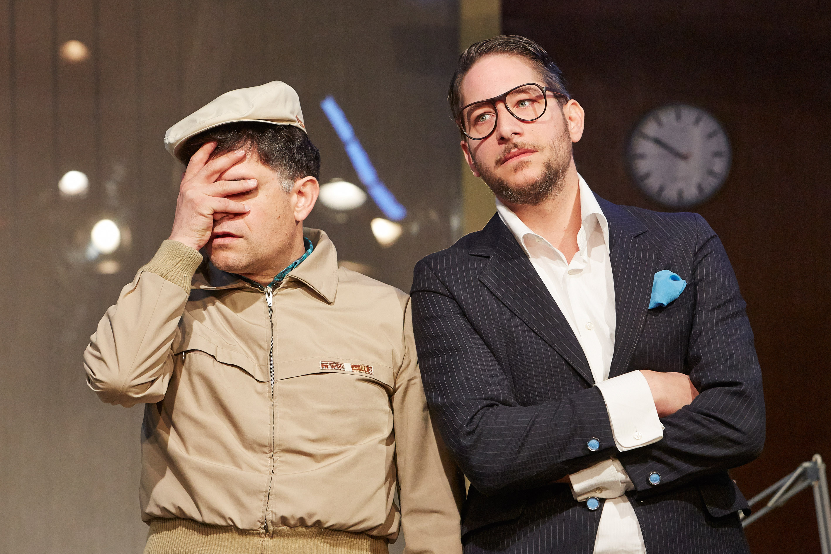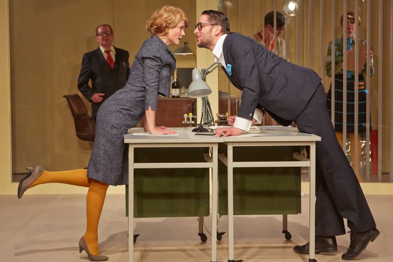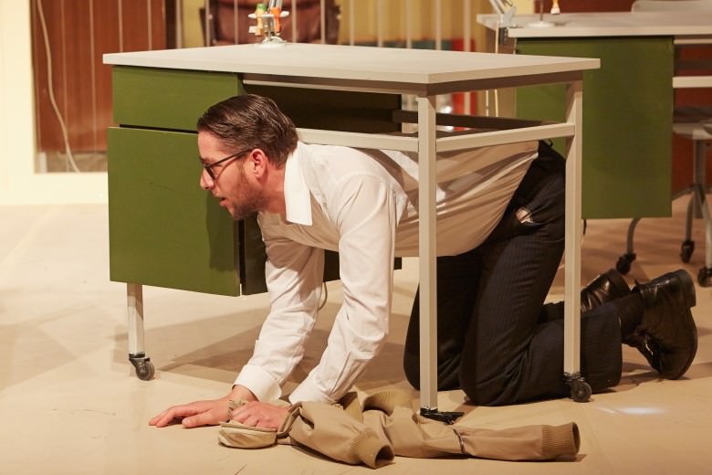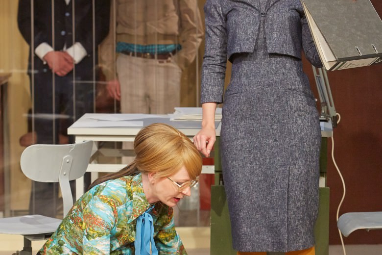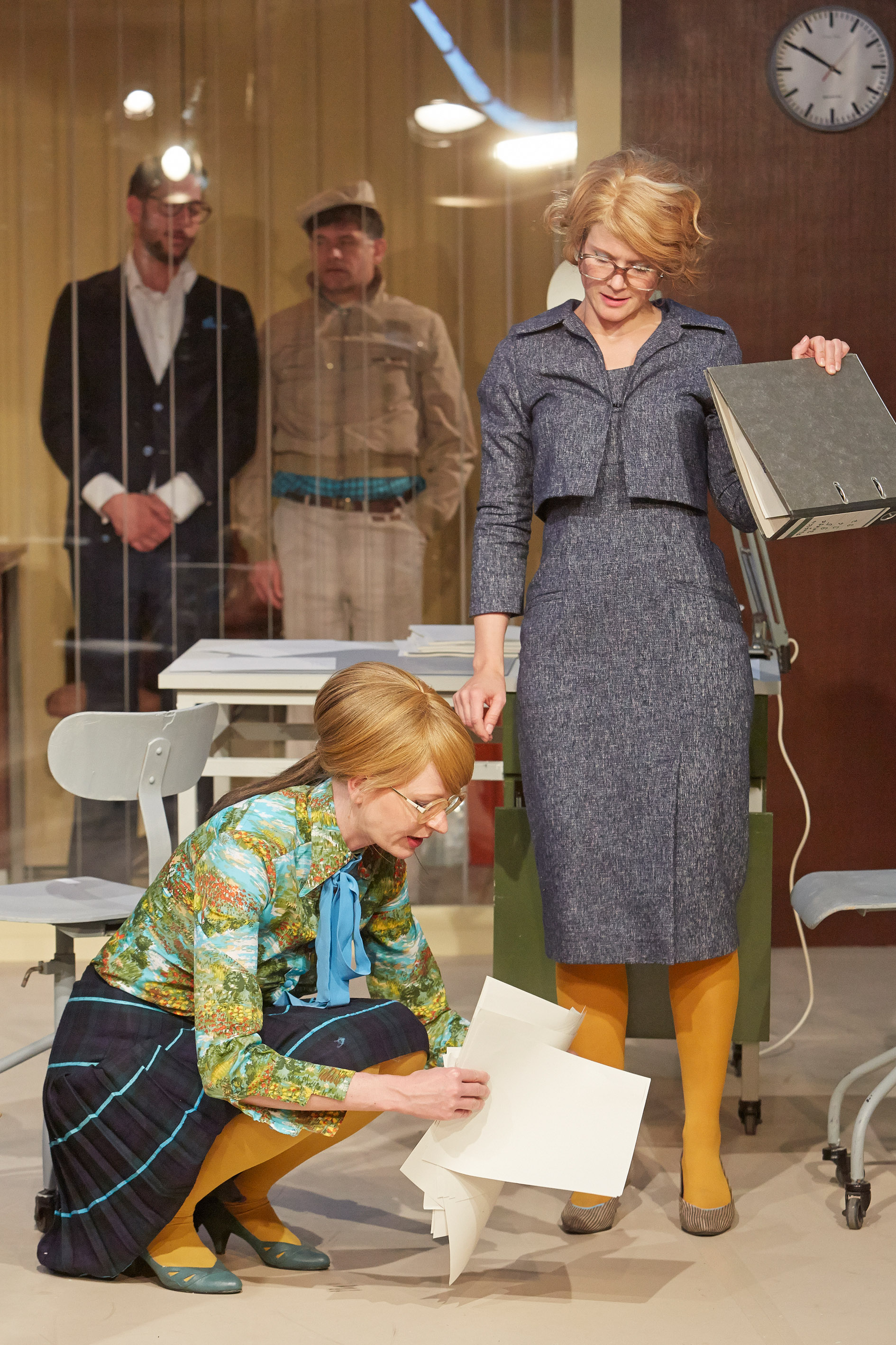 Das Seltsame und Schöne dieser Inszenierung ist: Die Bürokonstellation ist nur das Oberflächenangebot, man sieht immer auch die Marivaux-Vorlage durchschimmern. Ein Grund ist sicher die Sprache Marivauxs, ein anderer Grund dürfte im Spiel der Akteure liegen, die dem Komödienaffen manchmal so Zucker geben, das wir fast Typenfiguren einer galanten Komödie des 18. Jahrhunderts vor uns sehen.