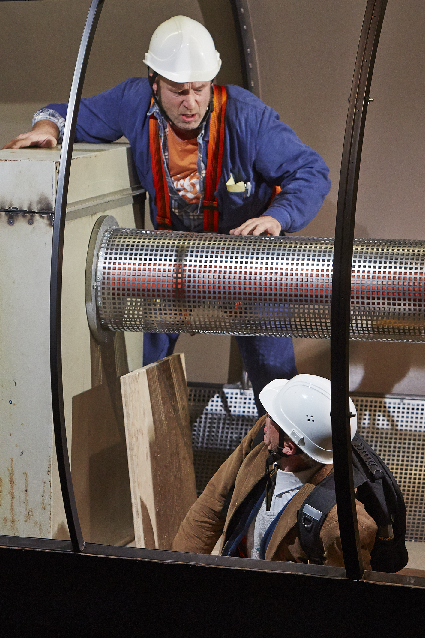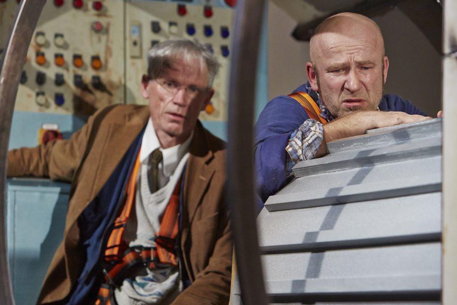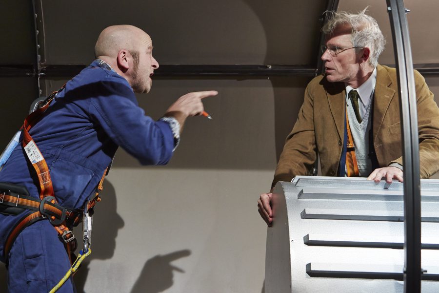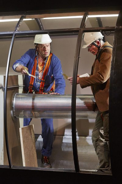 „Ein auch nur annähernd vergleichbares Bühnenbild ward bislang nicht gesehen: Wir blicken ins Innere eines Windrads in 100 Meter Höhe. Franz Xaver Ott als großtönendes Gscheiderle mit nix dahinter, Berthold Biesinger als armes Würstchen – beide Schauspieler glänzend aufgelegt. Und da im technisch-theoretischen Trockenkurskauderwelsch der beiden Termini der Medizin, der Wirtschaftswissenschaften und des Maschinenbaus sich unentwirrbar gegenseitig durchdingen, wird schnell klar: Dieses Windrad steht für mehr. Konsequenterweise macht der eine den anderen nicht nur für das niederschmetternde Ergebnis der Reparatur, sondern gleich für alle Übel der Welt verantwortlich, von der Klimaerwärmung bis zum Syrienkrieg. Was noch wie ein Gag klingt, bekommt wenig später eine so absurd-philosophische wie ernstgemeinte Dimension. Nicht der Wind lässt hier das Windrad laufen, sondern umgekehrt, das nun endlich laufende Windrad macht erste den Wind. Eine schönere und schrägere Parabel dafür, dass der Mensch (und sein verlängerter Arm Maschine) seine Welt zu großen Teilen erst erschafft, ist kaum denkbar. Die Clownerie endet in einer Warndystopie. Ein Ende, so hart und Genregemütlichkeit zerstörend, wie es die Welt um uns herum derzeit verlangt.“