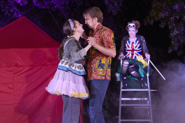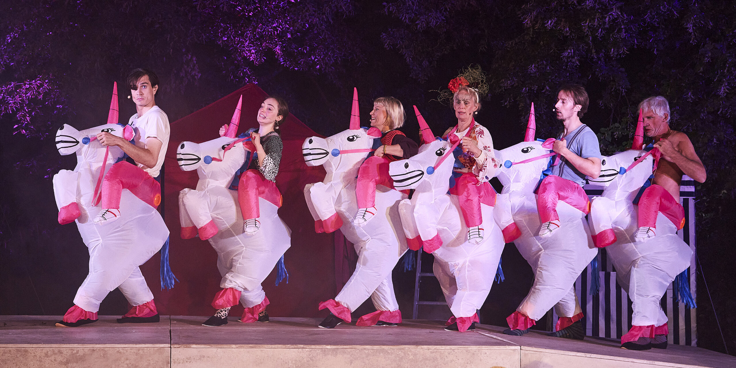 Waldherrscher Oberon ist wegen fortdauernder Streitigkeiten mit seiner Elfenkönigin Titania verreist und so wird sein Narr Puck zum Strippenzieher des Spiels. Er macht sich einen Riesenspaß daraus, mit dem Saft der Zauberblume zwischen den Liebenden Hermia, Lysander, Helena und Demetrius ein einzigartiges Verwirrspiel anzustiften. Aber nicht nur mit ihnen treibt er seinen Schabernack, sondern auch mit einer Handwerkertruppe, die im Auftrag des Herzogs ein Schauspiel auf die Bühne bringen soll – für die Gruppe eine schier unlösbare Aufgabe, die gewitzte Lösungen braucht. Nicht einmal vor der Elfenkönigin Titania macht Puck halt. Auch ihr träufelt er den Trank ins Auge, der sie dazu bringt, dem nächstbesten Wesen in Liebe sich hinzugeben. Es ist der Handwerker Zettel, der gerade noch großes im Schauspiel vorhatte, aber ebenfalls von Puck verwandelt nun Titania verfällt. Und so verstricken sich die Ebenen des Spiels und entspinnt sich eine Achterbahnfahrt der Gefühle. Welch eine Nacht!