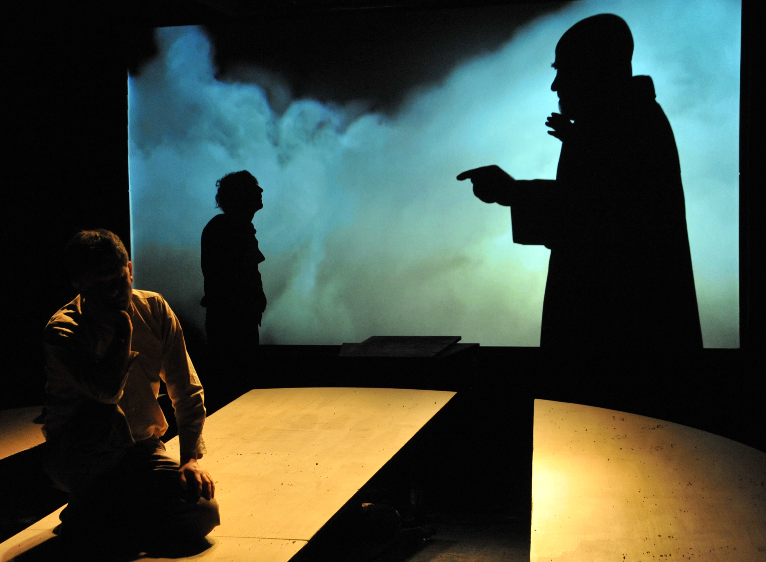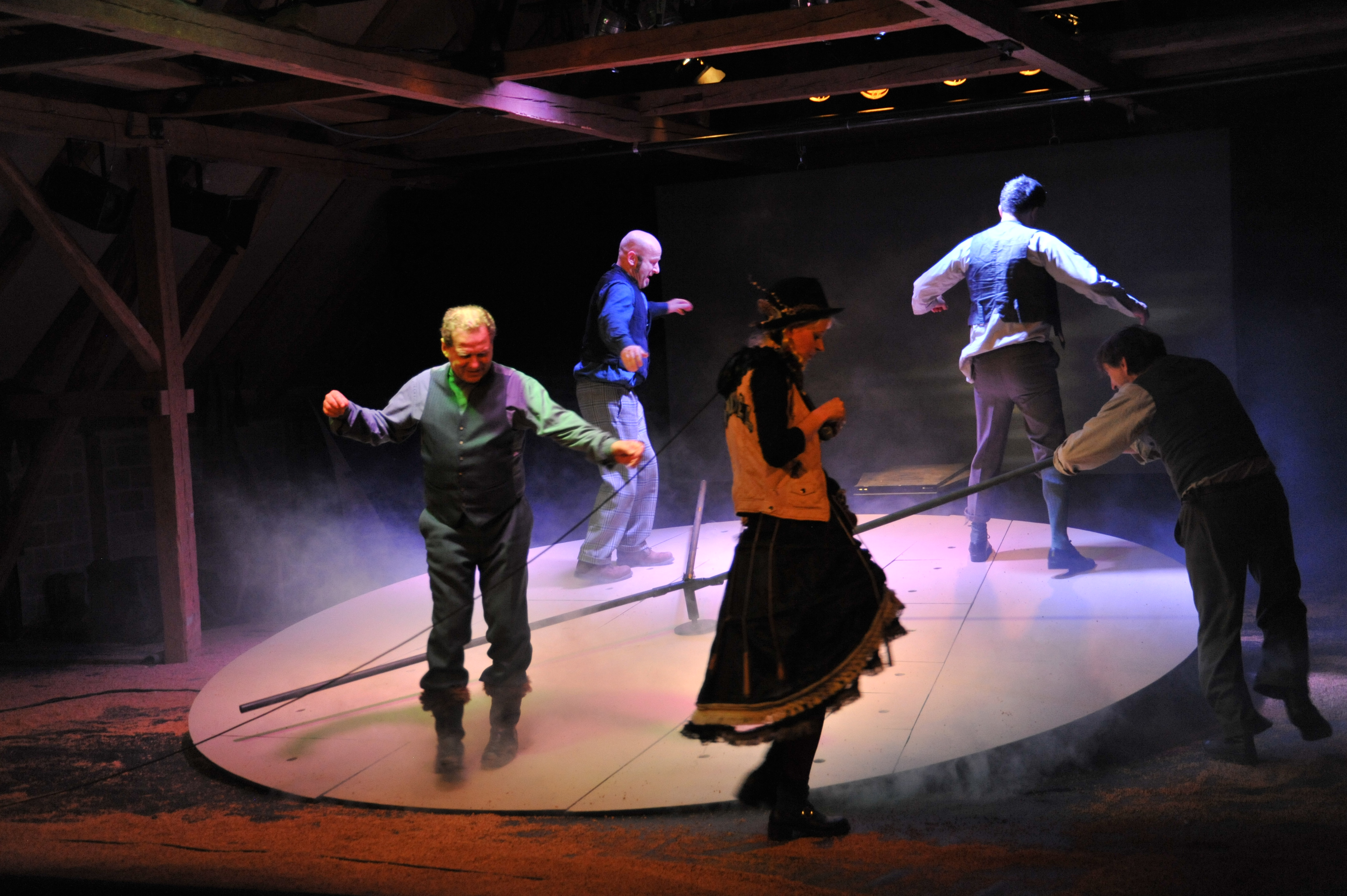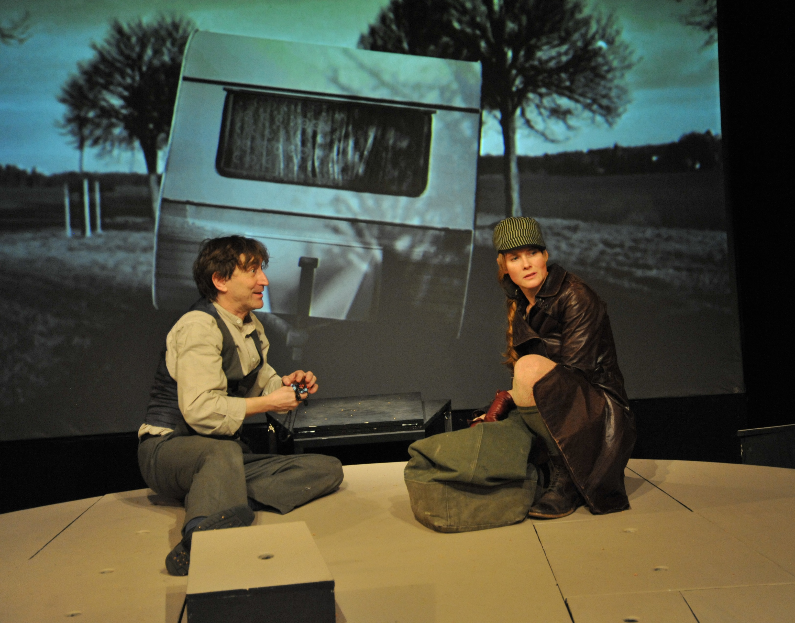 Hans ist ja auch eher so fürs Freie, Offene, Unbeschwerte. Besitz belastet ja nur. Und so wird ihm bekanntlich nach und nach alles abgeluchst. Oliver Moumouris als rhetorisch versierter Schwerenöter mit leicht aggressiven Untertönen schwatzt Hans dessen liebe Frau ab. Moumouris wird im Laufe des Stücks noch so einige Male als schmierig-erpresserischer Blender- Typus ziemlichen Grusel verbreiten: ein eloquenter Wolf im Schafspelz, der gerne mal über das "Menschliche" doziert. Hans jedenfalls ist jedes Mal mächtig beeindruckt. Cornelius Nieden ist als Hans im Glück ebenfalls bestens besetzt. Er kann unheimlich naiv-dümmlich dreinschauen, ist die Gutmütigkeit in Person, hat zu aller Welt vollstes Urvertrauen, kann zwar "nicht so schnell denken", aber umso rasanter fühlen (...) grinst und strahlt und reißt seine Augen auf, als gäbe es kein Morgen. (...) Hans will Freiheit, Sonne, Wind und Wolken. Und so verkörpert Cornelius Nieden den poetischen Luftikus, den unkonventionellen Müßiggänger, Zwecks- und Zwangsoptimisten, gutmütigen Lebenskünstler, Ökonomie-Verweigerer, naturbekifften Traumtänzer und gutgelaunten Antikapitalisten, der die Leichtigkeit des Seins perfektioniert bis in den Tod.