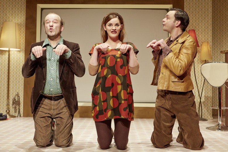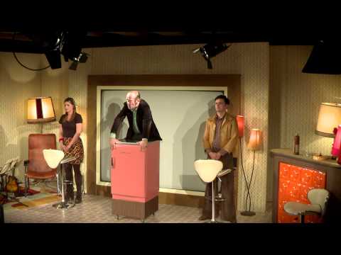 Zwei Mann auf der Bühne, ein Diaprojektor samt Leinwand, ein paar Instrumente – viel mehr brauchen die beiden von Carola Schwelien inszenierten Protagonisten nicht: Quizmaster Bernhard Hurm und Musiker Wolfgang Karrer, der sich im Verlauf von »Übers Land« vom musikalischen Sidekick zum gleichberechtigten zweiten Frontman entwickelt, bieten eine fröhliche, chaotisch-rasante Mischung aus Quiz, Show und Konzert – vereint mit dem etwas altbackenen und spätestens seit Mitte der 1980er-Jahre verpönten Konzept des Dia-Abends. (Michael Sturm)