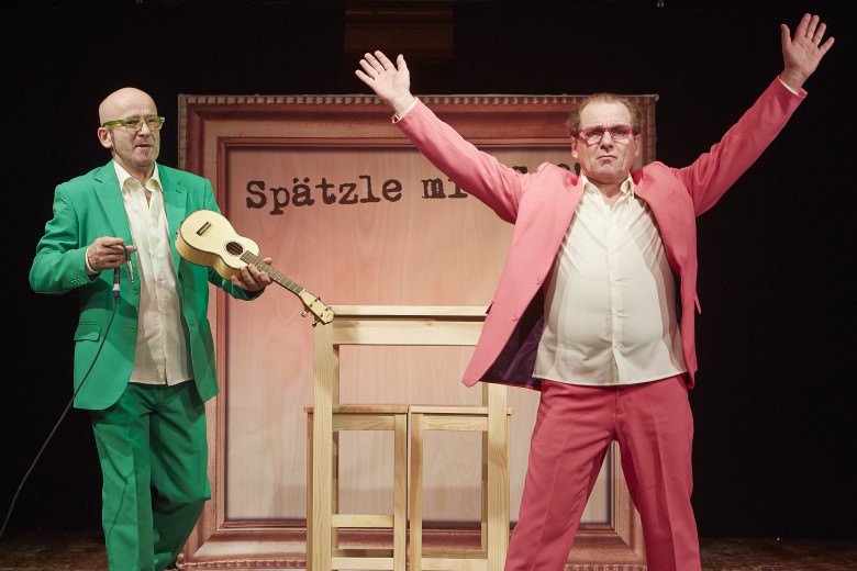 Wolfram Karrer und Gerd Plankenhorn setzten unter der sehr offensichtlich mehr als gelungenen Regie von Heiner Kondschak darauf, dass man ihnen auch wirklich zuhört. Und wer sich darauf einließ, wurde mehr als bloß satt. Der genoss dabei einen Gang nach dem anderen, unausgesetzt alles, wirklich alles, was man sich auf der Speisekarte des gehobenen Humors wünschen kann. Man genoss Doppelbödigkeiten, Hinterhältigkeiten, Abschweifungen, regelrechte Umwege, Boshaftigkeiten, Streicheleinheiten, auch einmal einen gezielten Schuss knapp daneben, zarte, ja zärtliche Andeutungen ebenso wie mächtige Kalauer vom Zuschnitt eines Rostbratens. Und bei aller Fülle und schauspielerischer Präsenz, mit der Gerd Plankenhorn und Wolfram Karrer schnippelten, schmorten, kochten, brieten, war – und das will etwas heißen bei der allgemeinen Qualität, die bei ihnen so absolut selbstverständlich daherkommt- , die Musik doch die vielleicht allerbeste Zutat dieses großartigen Abends in der kleinen schwäbischen Küche, die am Ende erkenntnistechnisch eben auch so eine Art große Welttheater ist. Ein Welttheater mit Musik. Und mit Rappern, die den Mehlmotten-Wrap ums Kraut wickelten oder in Heidenheim einen Flamenco heraushauten, den man garantiert auch in Sevilla auf Anhieb verstanden hätte, selbst wenn einem dort der Titel „Spätzle ghörad gschabt“ womöglich ein wenig spanisch vorgekommen wäre. (Manfred F. Kubiak)
