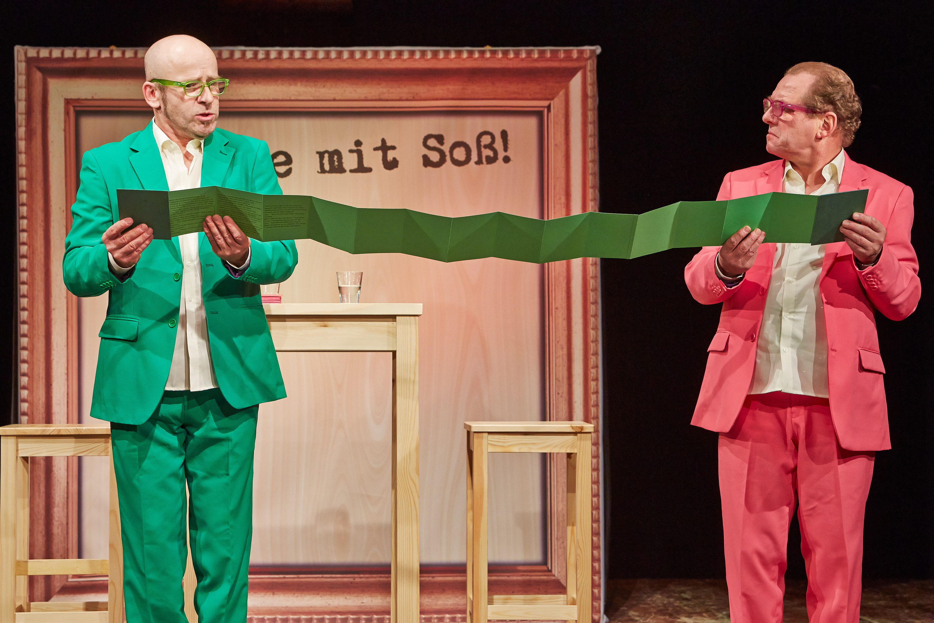 Ohne Samthandschuhe, aber mit viel Spitzfindigkeit und Selbstironie bringen Biesinger und Hurm ihr Publikum zum Jauchzen. Die beiden so verschiedenen Typen funktionieren bestens: egal ob beim Liedersingen, Gedichtchen rezitieren oder nachgestellten Kneipenszenen. Es gibt kein schwäbisches Klischee, das die beiden nicht aufarbeiten und auf die Schippe nehmen. „Spätzle mit Soß!“ ist eine köstliche und kurzweilige Unterhaltung.