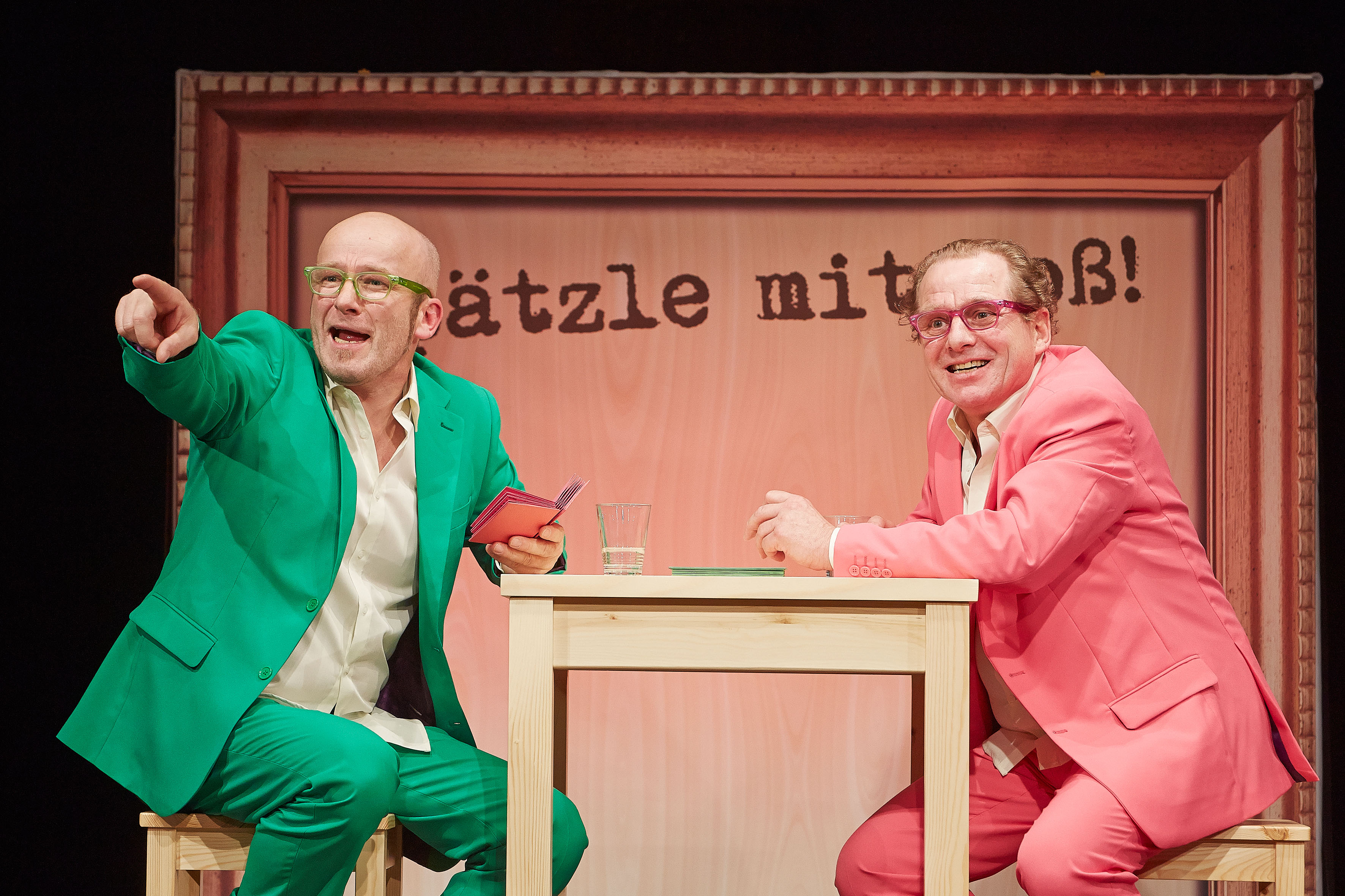 Robert und Josef, wie die Bühnenfiguren heißen, tauschen sich beim durchsichtigen, zuletzt grünen Most über Wehwehchen aus und kommentieren hintersinnig die Zeitläufe. Sie sinnieren darüber, dass der Dialekt bereits auf dem Rathaus angekommen sei. Liebevoll zerpflückt das Duo französische Lehnwörter wie Trottoir und Souterrain. Schwäbische Erfindungen werden gewürdigt, Geistesblitze prasseln ohne Verhaspler. Es wird zitiert und gesungen: Texte und Szenen von Manfred Hepperle, Helmut Pfisterer, Sebastian Blau. Ein herzerwärmendes „Winterlied eines schwäbischen Bauernjungen“, im zweiten Teil eine Moritat vom Feldkreuz. Die beiden Erzkomödianten spaßen über schwäbische Ordnungsliebe, über „Sotte und Sotte“, zitieren Unsinns-Poesie herbei. Nach einem finalen Schwabenrap Arm in Arm zum Mitsingen erklatscht sich das Publikum eine Zugabe. (Matthias Reichert)